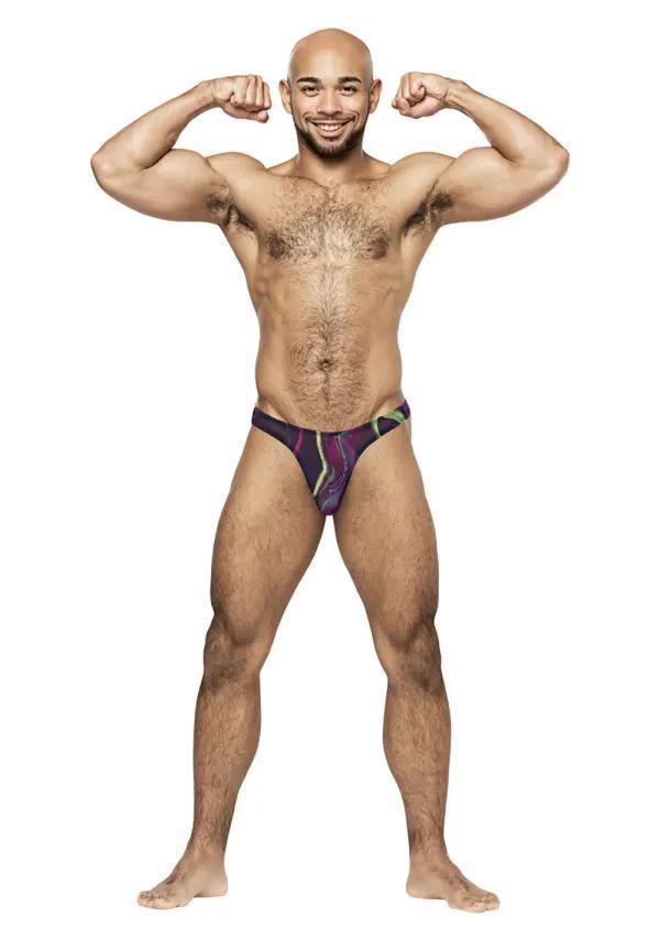 Galactic Print Bong Thong L/XL from Male Power Lingerie. From the Galactic collection by Male Power, the Bong Thong features a slim elongated pouch, a low cut waist and a classic 1 inch thong back. Smooth sheer micro Mesh Fabric with all way stretch, cosmic themed multi color print throughout. Materials fabric content: 90% Nylon, 10% Spandex. Men sizes large to extra large, L/XL. 36 inches to 41 inches. Care instructions hand wash separately, cold water, line dry. Do not bleach. Categories: Lingerie, Clothing, Men's Underwear. Lingerie, Clothing, Naughty Role Play, Men's Underwear, Men's Fetish Wear.
